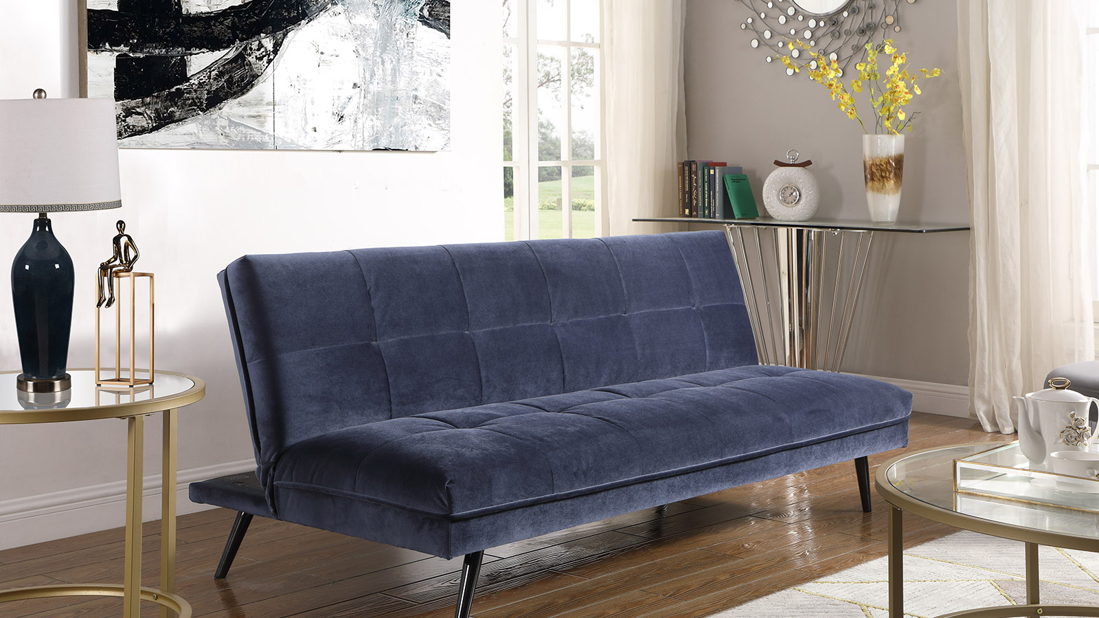 The AYLA upholstered in soft and durable velvet fabric featuring an earth color for a modern touch. It also comes with unique design of black metal slanting legs. The AYLA is a modern, adjustable sofa bed which can be laid flat or propped upright to create a backrest, turning it quickly and easily from day lounge to sofa.
