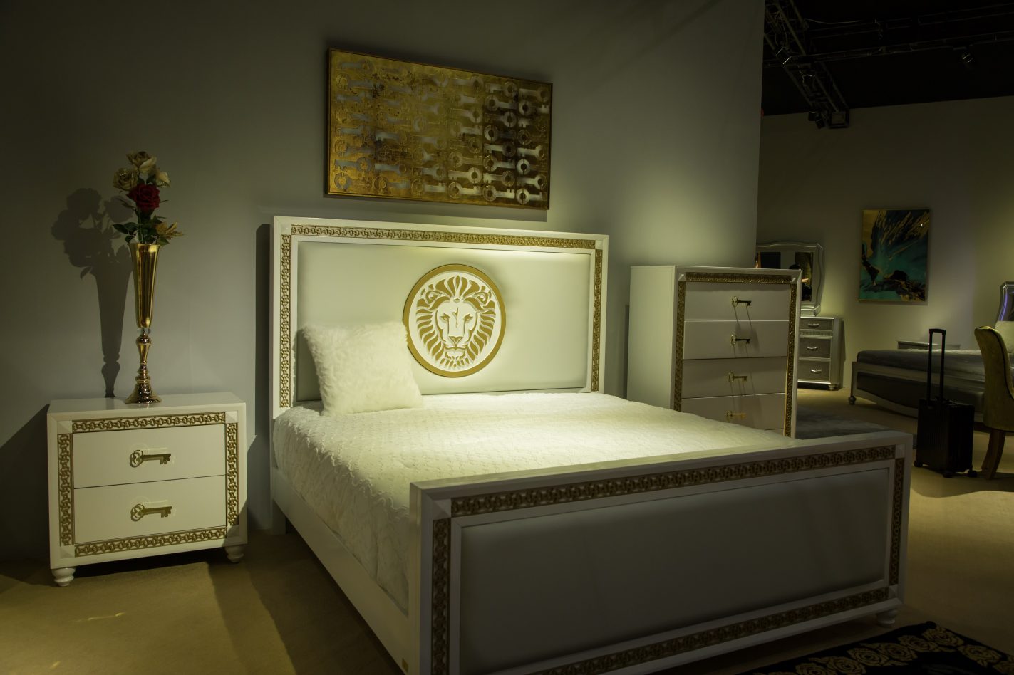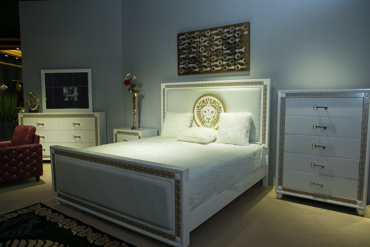 This finely upholstered luxury sleep throne gives you the keys to more success with its clean white contours, custom gold key engraved borders along the headboard and foot board, and an embossed BRIGHT LION! head seal royally centered along the padded headboard. The sleek padded, gold-key bordered foot board stands on elegant white bun feet, while across the low finely finished white base the headboard presents atop extended square legs for a fully integrated luxury design.
