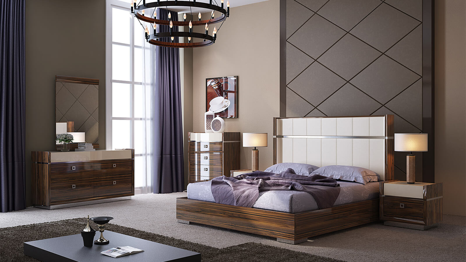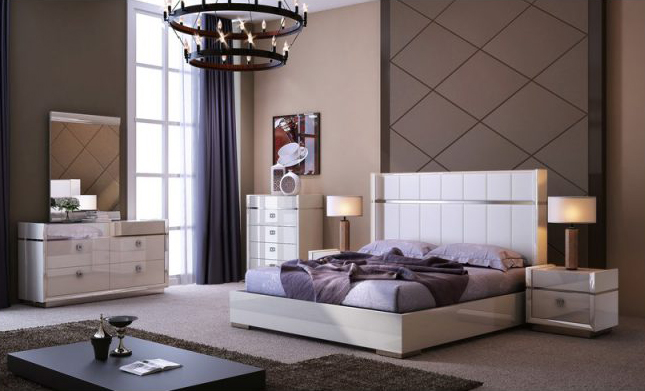 Exhibiting a streamlined design, this two tone bedroom set glistens beautifully with its luxurious ebony high gloss finish featuring wood markings on the surface. The sparkling handles of the cases and soft close glide completes the ensemble which give this set a luxe look and feel.